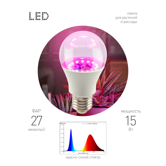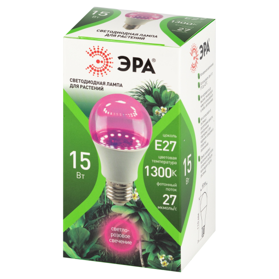 Фитолампа ЭРА GREEN LINE ФИТО A60–15W–PL–E27–GR — специализированное устройство для досветки растений: для выращивания зелени, пасленовых, декоративных растений. Универсальное решение. Фиолетовое свечение. Мощность — 15 Вт, тип цоколя — Е27, спектр излучения — красно-синий, форма — как у обычной лампы накаливания. Оптимальное расстояние до листьев — 10-25 см. Благодаря прозрачному рассеивателю лампы растения получают максимум света. Применён оптимальный для быстрого роста рассады ИК-спектр. Фитолампа безопасна в применении и утилизации.