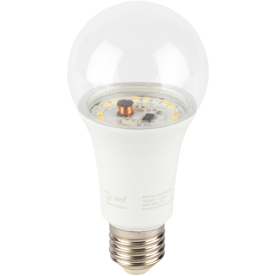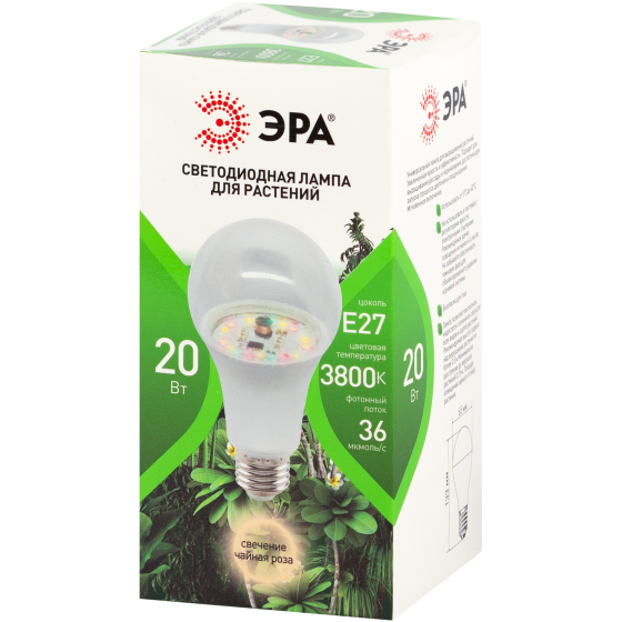 | Преимущества | Спектр излучения. Розовое свечение стимулирует фотосинтез и рост растений. Энергоэффективность. Потребляет всего 20 Вт, что снижает затраты на электроэнергию. Долговечность. Светодиодная технология обеспечивает долгий срок службы. Удобство использования. Цоколь E27 позволяет установить лампу в стандартный патрон. |