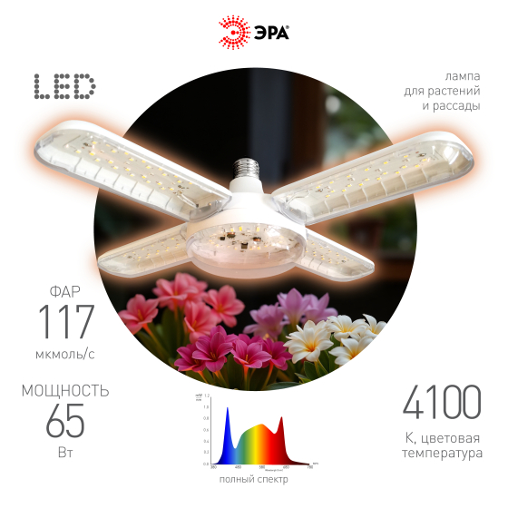 ЭРА GREEN LINE ФИТО-65W-PFR-E27-GR – 5-ти лепестковая лампа полного спектра мощностью 65 Вт, создана для того, чтобы ваши растения получали именно тот свет, который им необходим для активного роста и развития. Световой поток в 117 мкмоль/с обеспечит яркое и насыщенное освещение, сравнимое с солнечным, а приятное свечение "чайной розы" с цветовой температурой 4100 К не утомит ваши глаза и создаст комфортную атмосферу в доме.