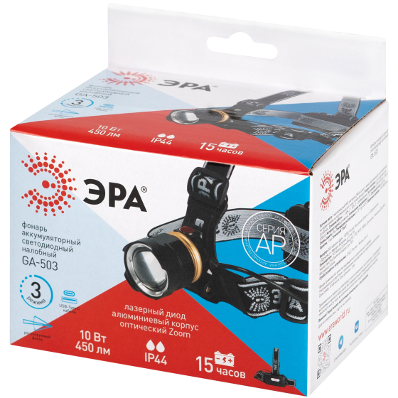 Фонарь налобный светодиодный ЭРА GA-503 Орешник серии Армия России, аккумуляторный, мощностью 10 Bт, 3 режима. Дальность луча - 150 м.