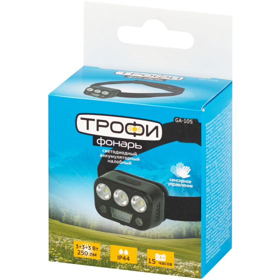 Фонарь налобный светодиодный Трофи Налобные GA-105 аккумуляторный 3+3+3 Bт сенсорное управление 5 режимов