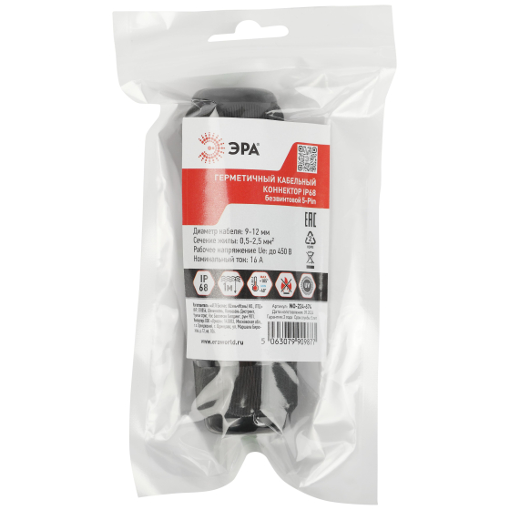 Коннектор ЭРА NO-224-674 кабельный прямой 5-Pin 0.5-2.5 мм2 безвинтовой IP68 применяется для соединения проводников, которым требуется обеспечить полную герметичность. Может использоваться под водой и под землёй без угрозы потери качества соединения.