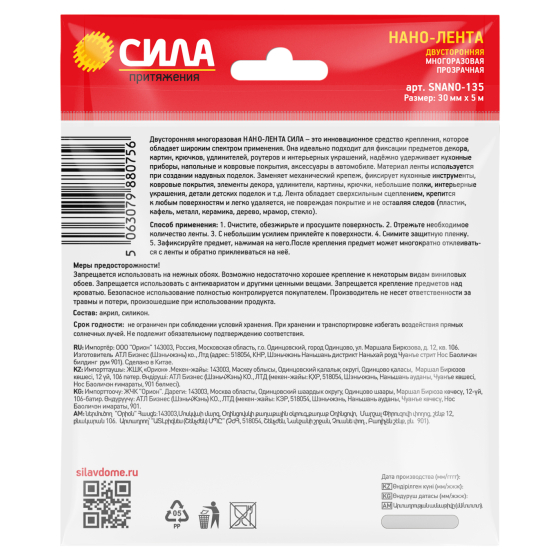 Заменяет механический крепеж, фиксирует кухонные инструменты, ковровые покрытия, элементы декора, удлинители и хабы, картины, крючки, небольшие полки, интерьерные украшения, детали детских поделок и т.д. Лента покрыта большим количеством отверстий наноразмера, благодаря которым обладает сверхсильным сцеплением. Изготовлена из гелевого материала на акриловой основе. Легко клеится на любые поверхности: пластик, кафель, металл, керамика, дерево, мрамор, стекло. Крепится к любым не пористым поверхностям и легко снимается, не повреждая покрытие и не оставляя следов. Одно из важных преимуществ нано-ленты – устойчивость к влаге и сырости. Также лента отличается прочностью на разрыв, не теряет свойств при низких и высоких температурах, легко режется и может быть растянут и согнут в зависимости от потребностей. Клейкая лента не содержит токсичных веществ, утилизируется с пластиковыми отходами.