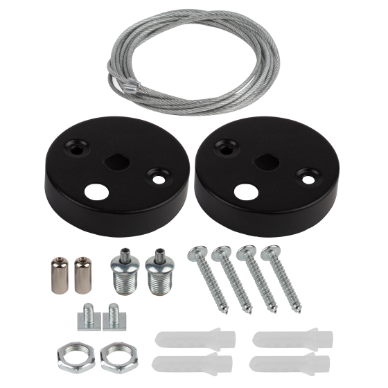 В крепёжный набор входят 2 комплекта креплений - для накладного и подвесного монтажа. Длину троса при подвесном монтаже можно регулировать (максимальная длина подвеса светильника - 1 метр).