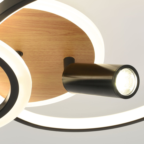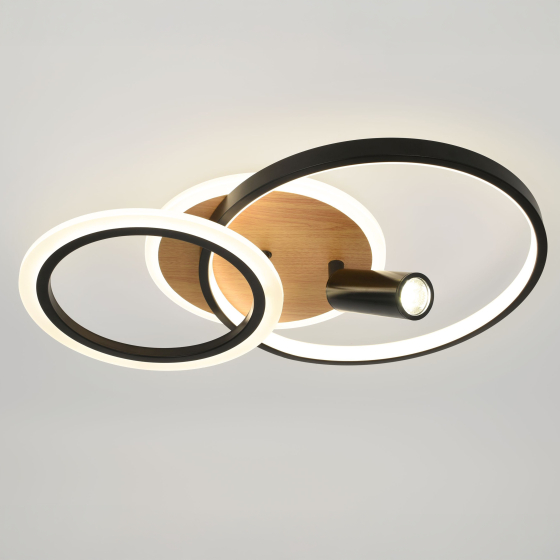 ЭРА Модерн Rondo CLL-1-85-RC BK - современный потолочный светодиодный светильник (led-люстра) в форме колец со встроенным поворотным спотом — стильное и функциональное решение для вашего интерьера. Оснащён пультом ДУ, позволяет удобно регулировать яркость и цветовую температуру от тёплого до холодного света (3000–6500К).
