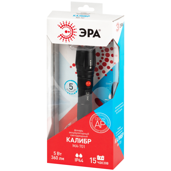 ЭРА АР Калибр оснащён ёмким литиевым аккумулятором (2100 мАч), одного заряда которого хватает на 7 часов непрерывной работы. Зарядное устройство в комплекте. Светодиодный луч повышенной дальности имеет возможность фокусировки. Пять режимов, удобных пользователю - от ближнего заливающего света (для того, чтобы хорошенько осмотреться вокруг в темноте) до длинного направленного луча (чтобы определиться с дальнейшим направлением пути).