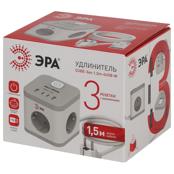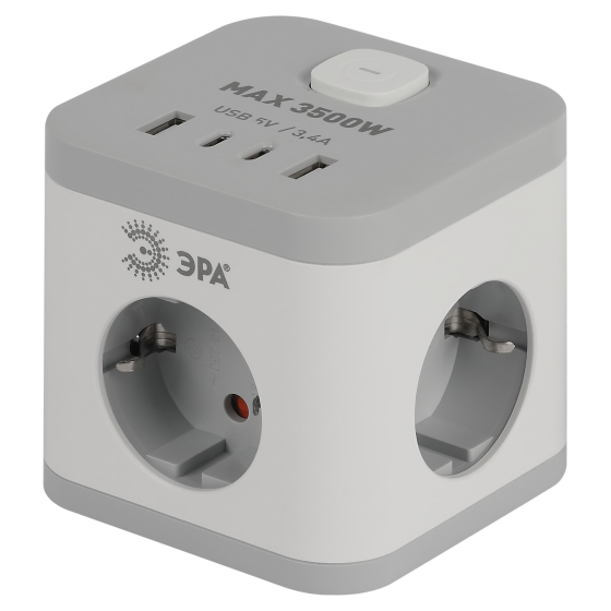 Удлинитель Эра CUBE-4es-1,5m-4USB-W рассчитан на одновременное подключение большого количества техники. На корпусе расположены 4 розетки с заземлением. Прочный корпус в виде башни из негорючего поликарбоната. Трехжильный провод ПВС обеспечивает допустимую максимальную нагрузку до 3500 Вт. Правильно подбирайте бытовые приборы, чтобы не превышать общую нагрузку на сетевой фильтр. 4 USB - 2typeA+2typeC 3.4A/5V. Длина провода модели составляет 1,5 метра. Удлинитель удобно использовать в пределах одной комнаты.