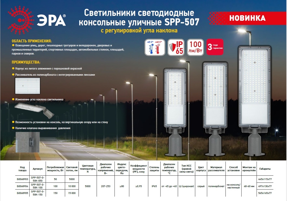 ЭРА SPP-507-0-50K-150 - светильник для освещения автостоянок, площадей, парков, коттеджных поселков, железнодорожных платформ и станций, мостов, территорий дворов, школ, пешеходных и велодорожек, дорожного полотна.