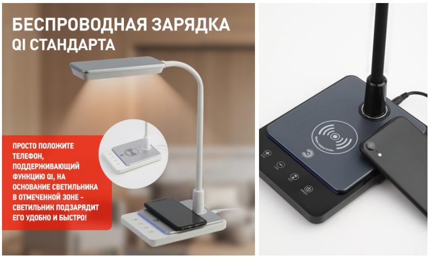 Также рекомендуем: настольный светильник ЭРА NLED-499-10W со светодиодами (LED) в качестве источников света. Оснащен сенсорным управлением с возможностью выбора цветовой температуры (теплый, нейтральный или холодный свет). Плавный диммер для регулировки яркости. Светильник сохраняет выбранные настройки при включении-выключении. Направление света регулируется наклоном и поворотом плафона в любом направлении. Светильник имеет встроенный модуль Qi для беспроводной зарядки мобильных устройств. Просто положите телефон, поддерживающий функцию Qi, на основание светильника в отмеченной зоне - светильник подзарядит его удобно и быстро!