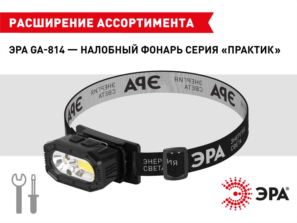 Серия налобных фонарей ЭРА пополнилась новой моделью — универсальным налобным фонарём ЭРА GA-814 с источниками света SMD и COB.