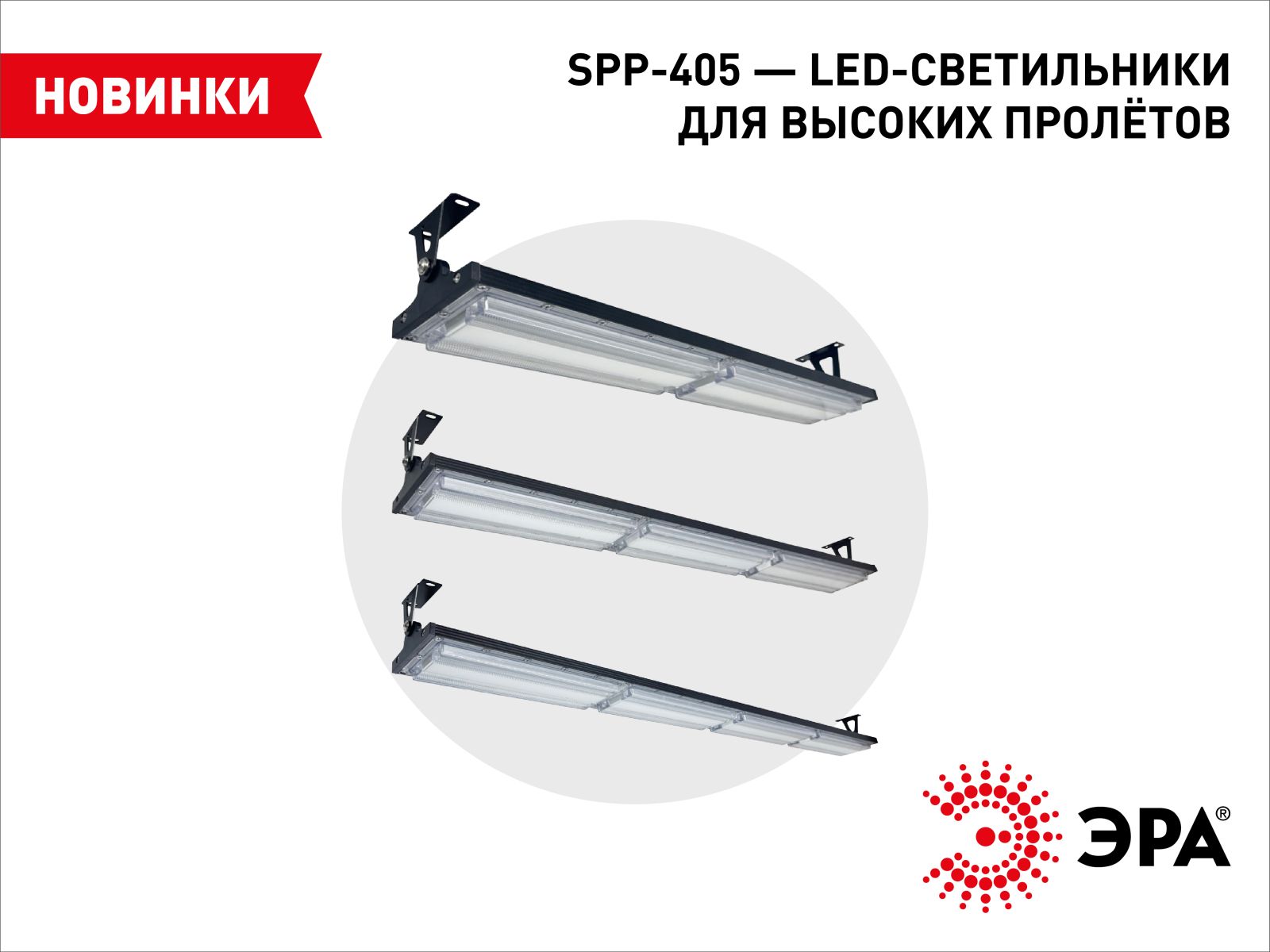 Серия ЭРА SPP-405 представлена в трёх вариантах мощности — 100 Вт (Б0062737 SPP-405-0-50K-100), 150 Вт (Б0062657 SPP-405-0-50K-150) и 200 Вт (Б0062743 SPP-405-0-50K-200), со световым потоком 10 000 лм, 15 000 лм и 20 000 лм соответственно. Компактные размеры (536х100х83 мм, 792х100х83 мм и 1048х100х83 мм) и продуманная конструкция позволяют использовать светильники в различных сценариях освещения. Угол рассеивания 120°×60° обеспечивает оптимальное распределение света в помещениях с высокими потолками.