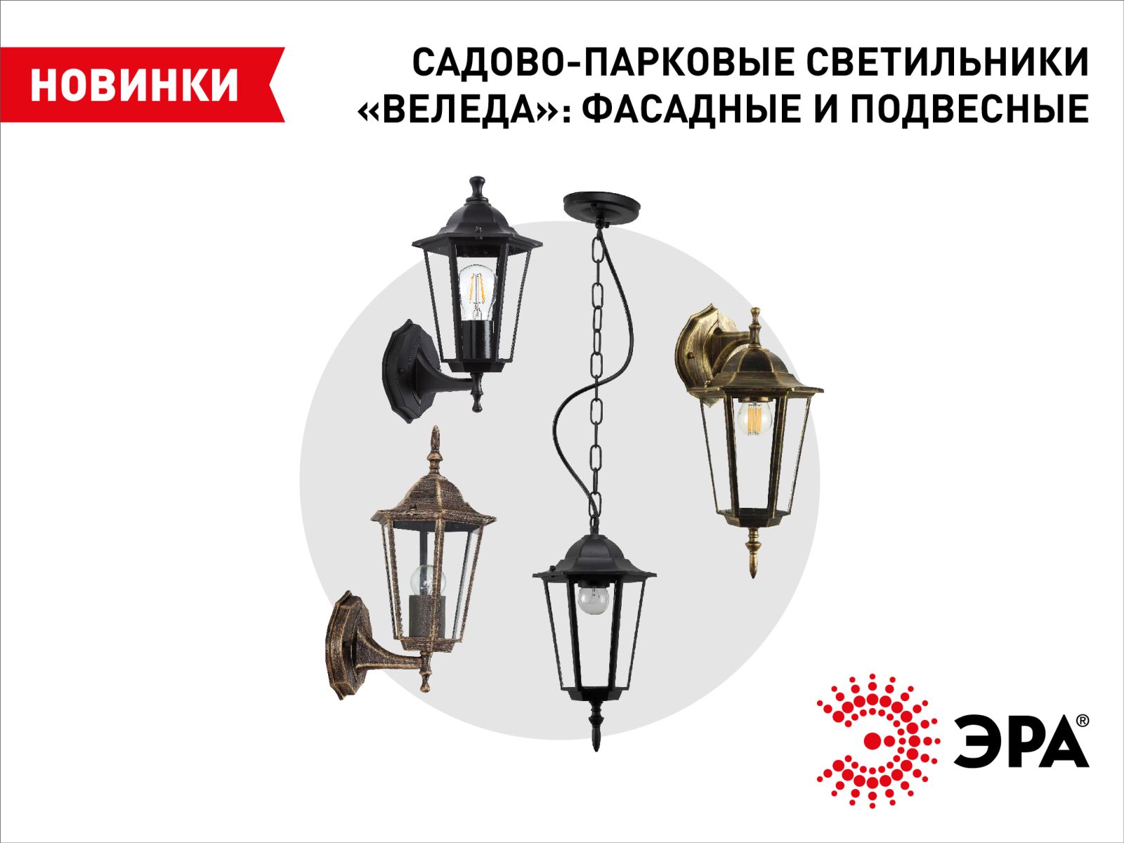 Садово-парковые светильники ЭРА «Веледа» выполнены в классическом стиле и подходят для оформления фасадов зданий, веранд, внутренних помещений загородных участков.