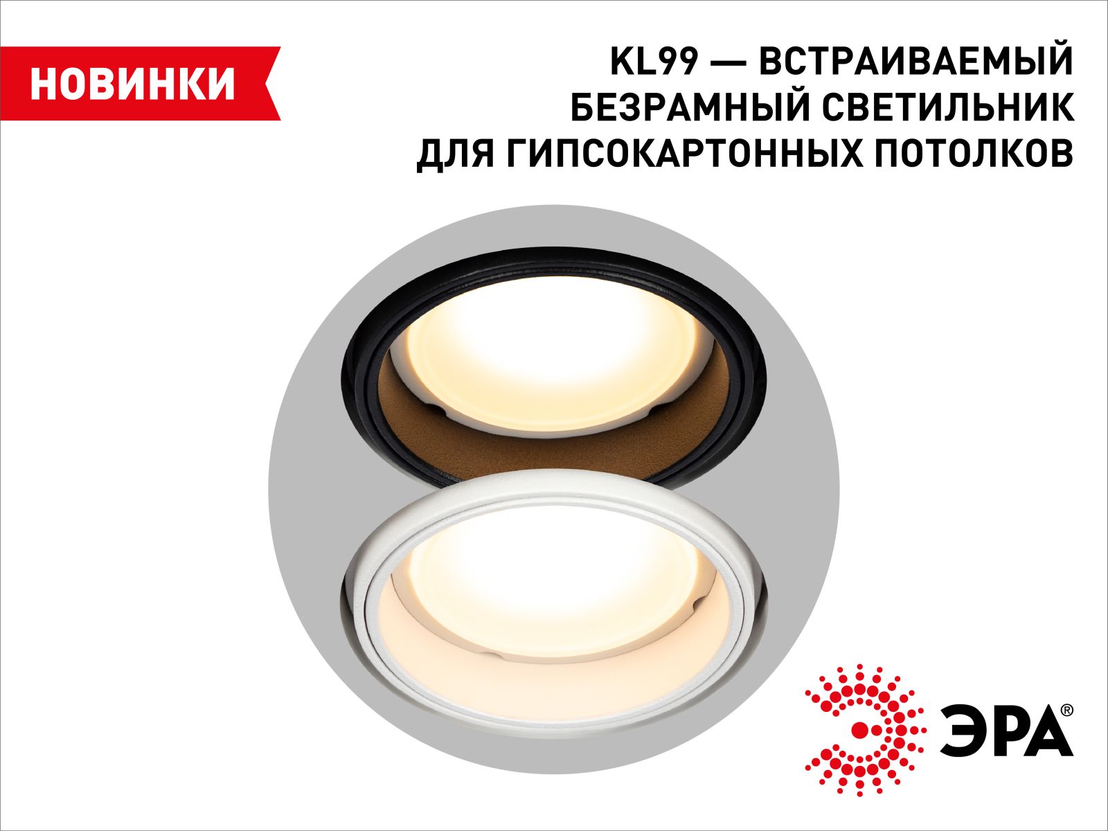 Встраиваемый безрамный светильник для гипсокартонных потолков ЭРА серии KL99 — решение, отвечающее актуальному тренду на максимальную интеграцию освещения в интерьер.